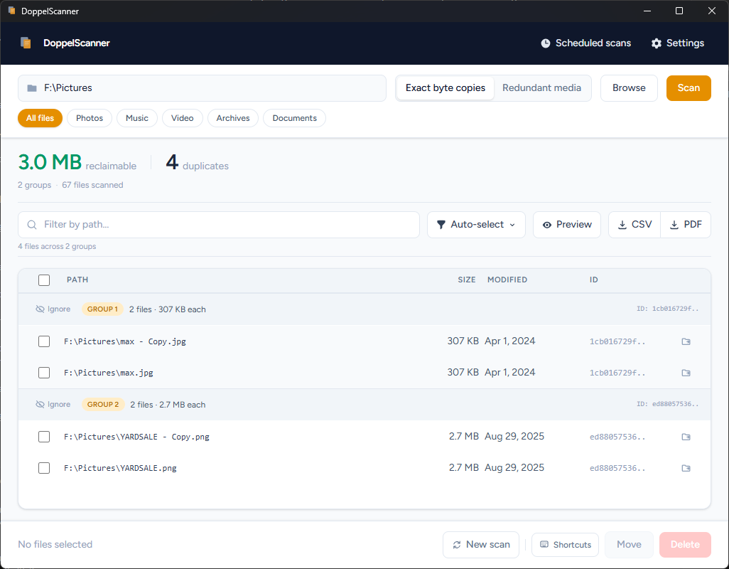 DoppelScanner scans at near-disk speed, identifies exact copies by SHA256 hash (not just name or size), and lets you review every match before touching anything. Fully offline. No subscription. No telemetry.